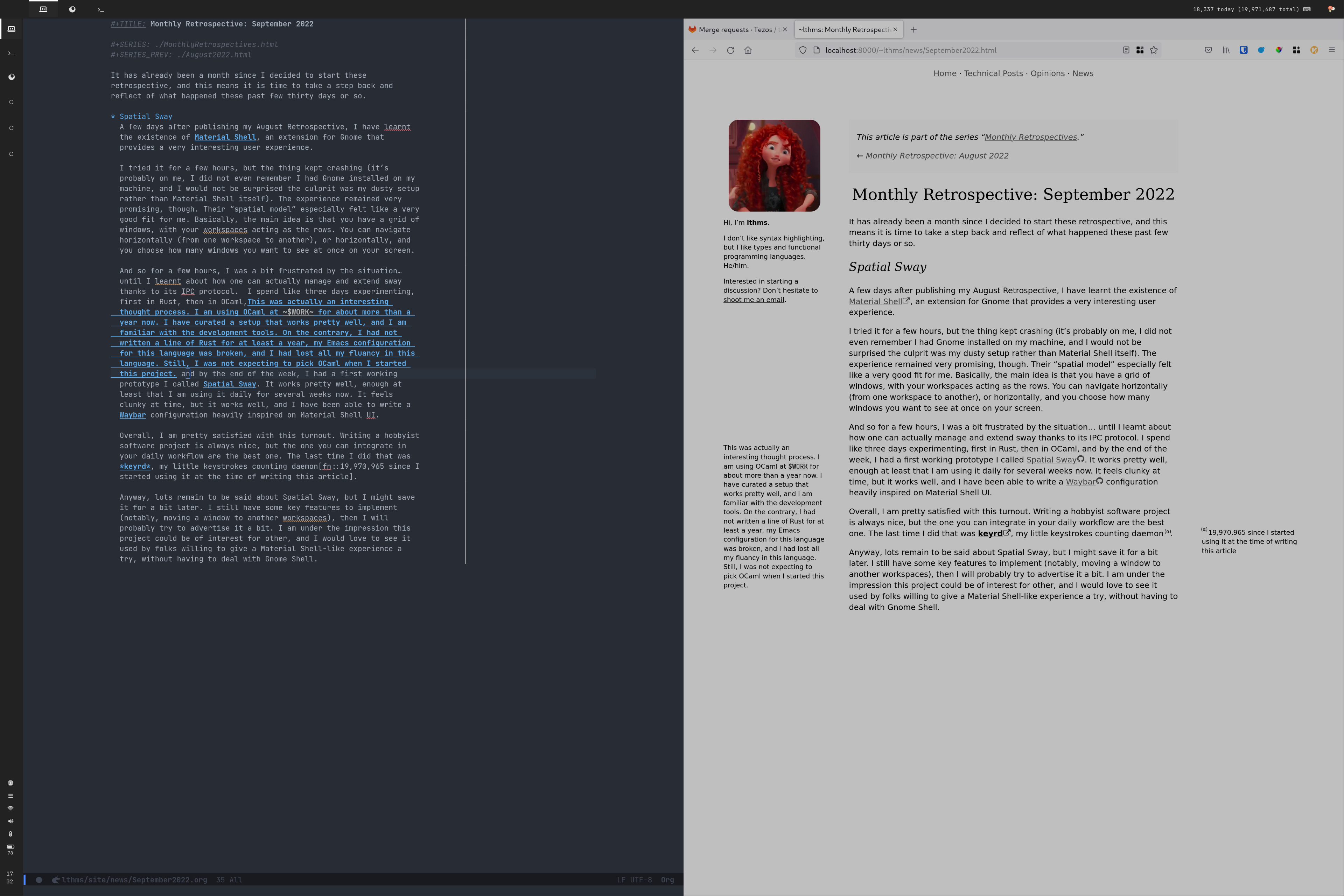 Anyway, lots remains to be said about Spatial Sway, but I might save it for a bit later. I still have some key features to implement (notably, moving a window to another workspace), then I will probably try to advertise it a bit. I am under the impression this project could be of interest for others, and I would love to see it used by folks willing to give a Material Shell-like experience a try, without having to deal with Gnome Shell. By the way, considering Sway is a drop-in replacement for i3, and that it implements the exact same IPC protocol, there is no reason why Spatial Sway is actually Sway specific, and I will rename it Spatial Shell at some point.
